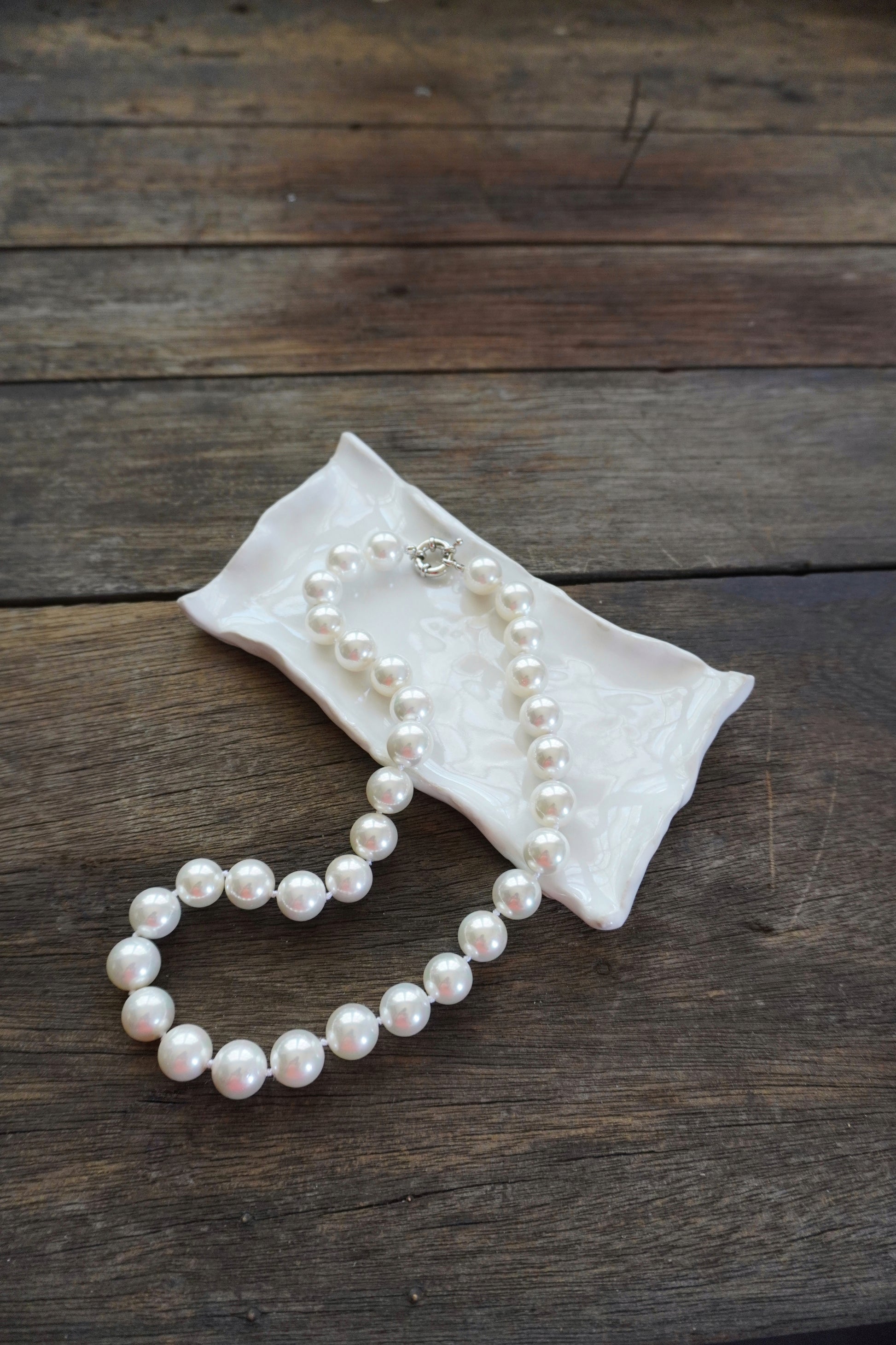 10mm shell pearls with sterling silver clasp.