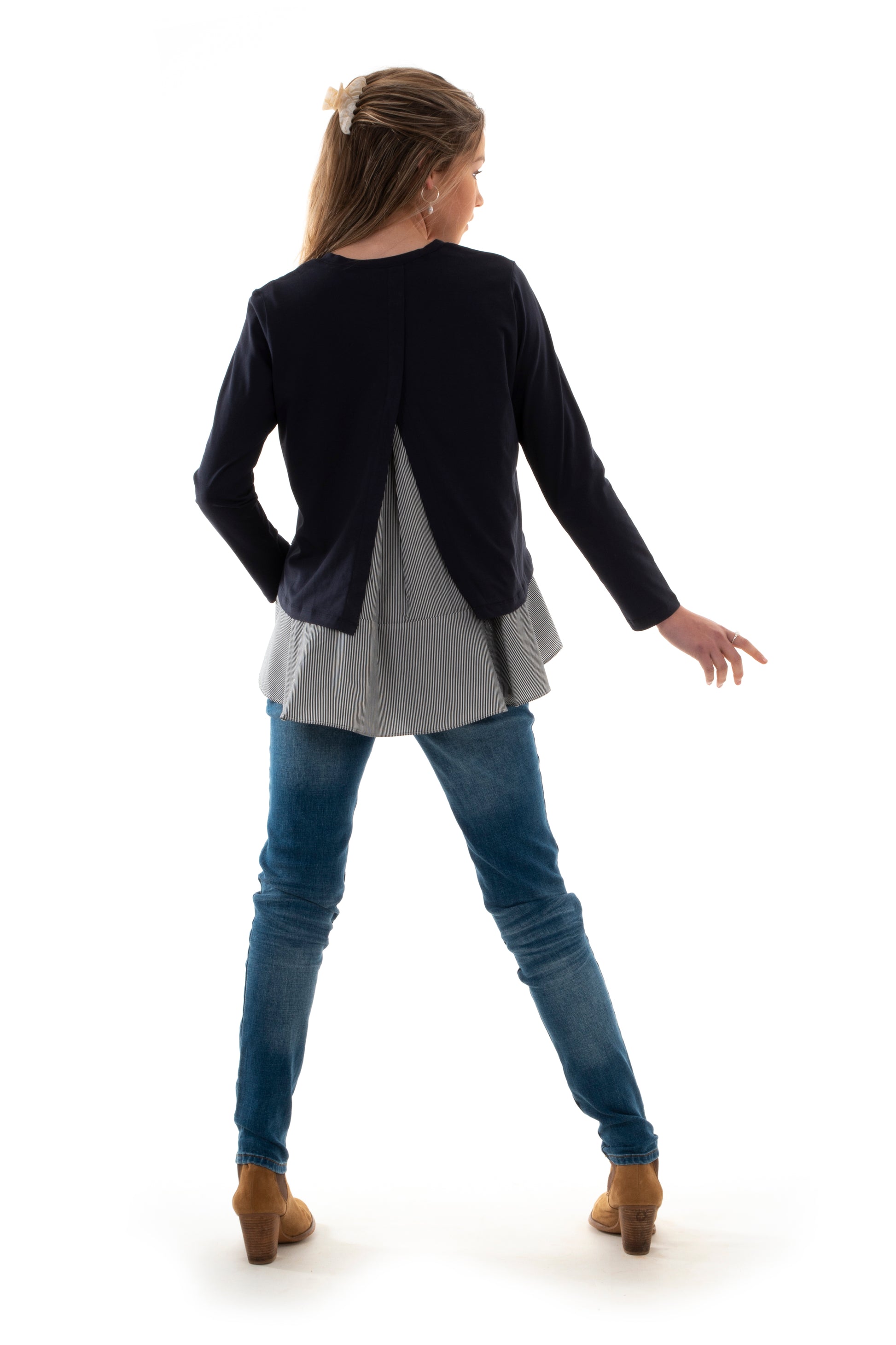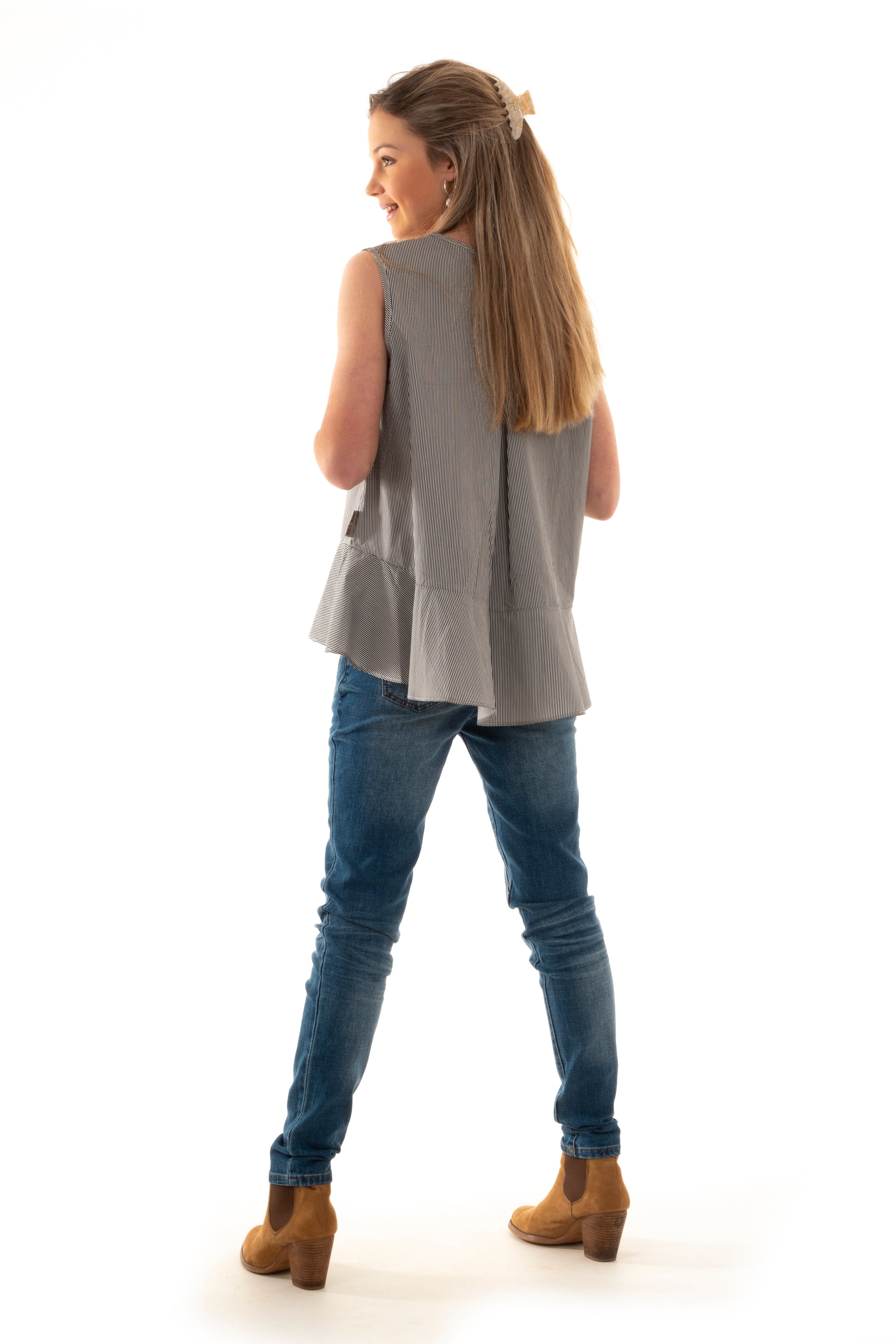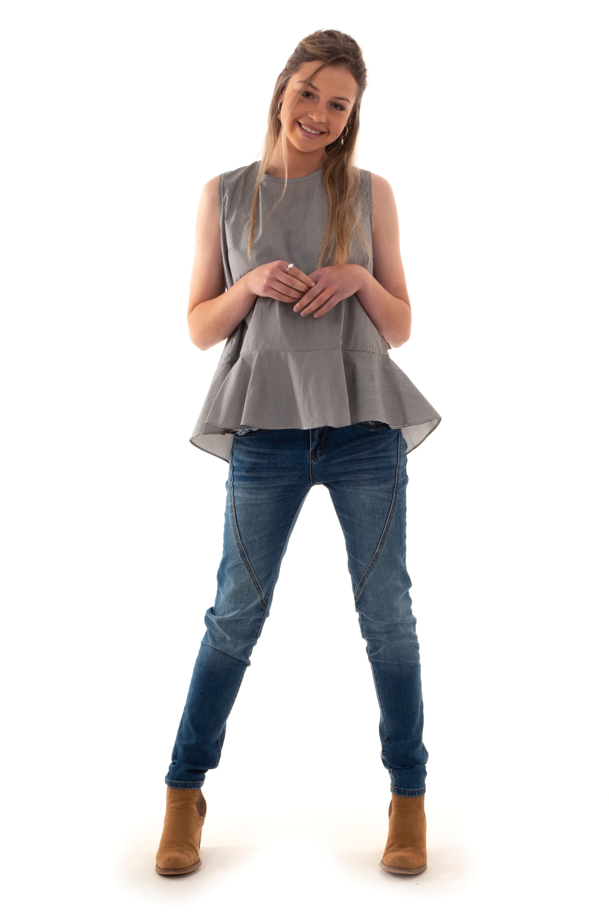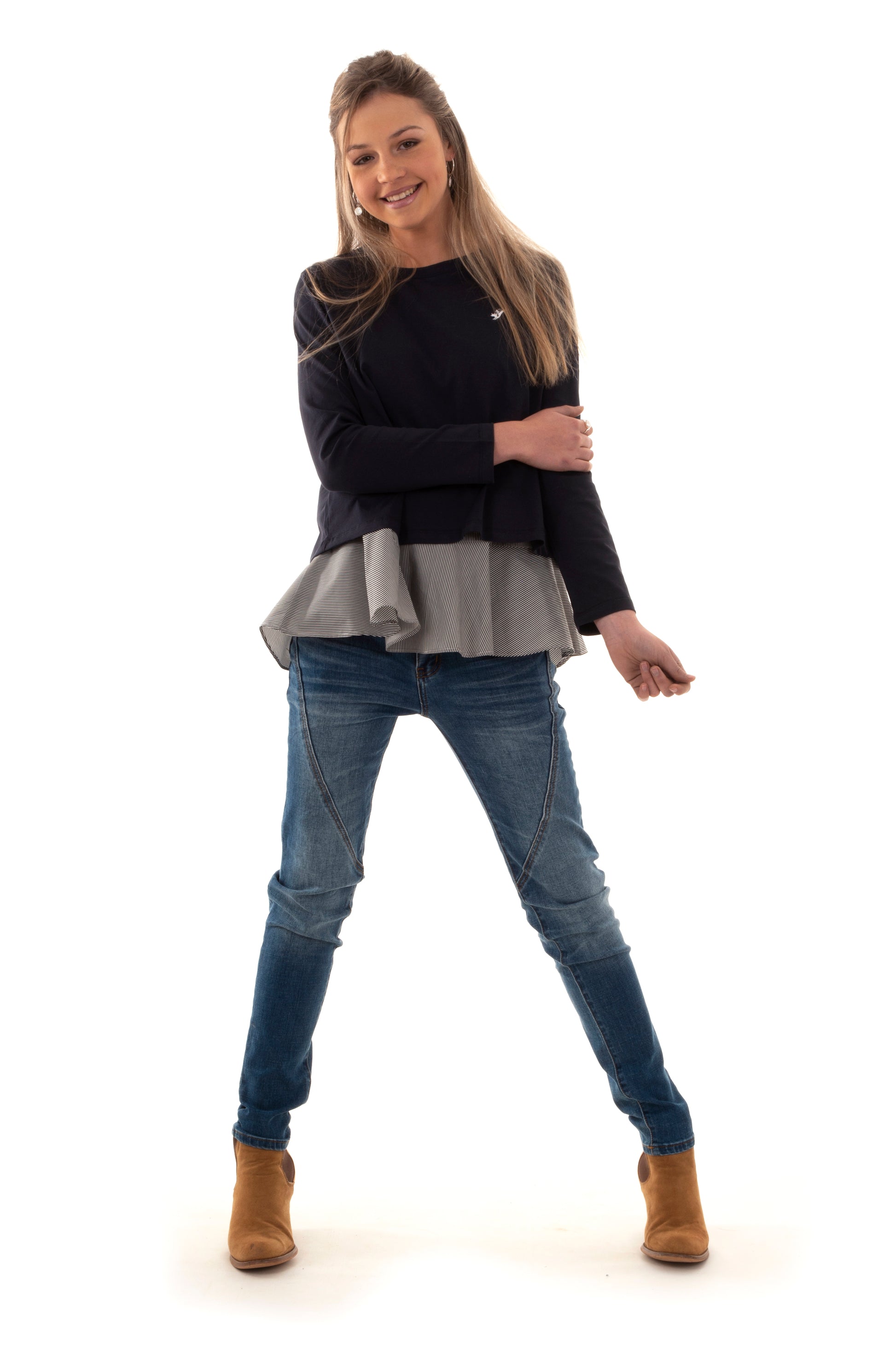 our size chart. For our denim, she wears a size 6. In tops, she wears a size S,