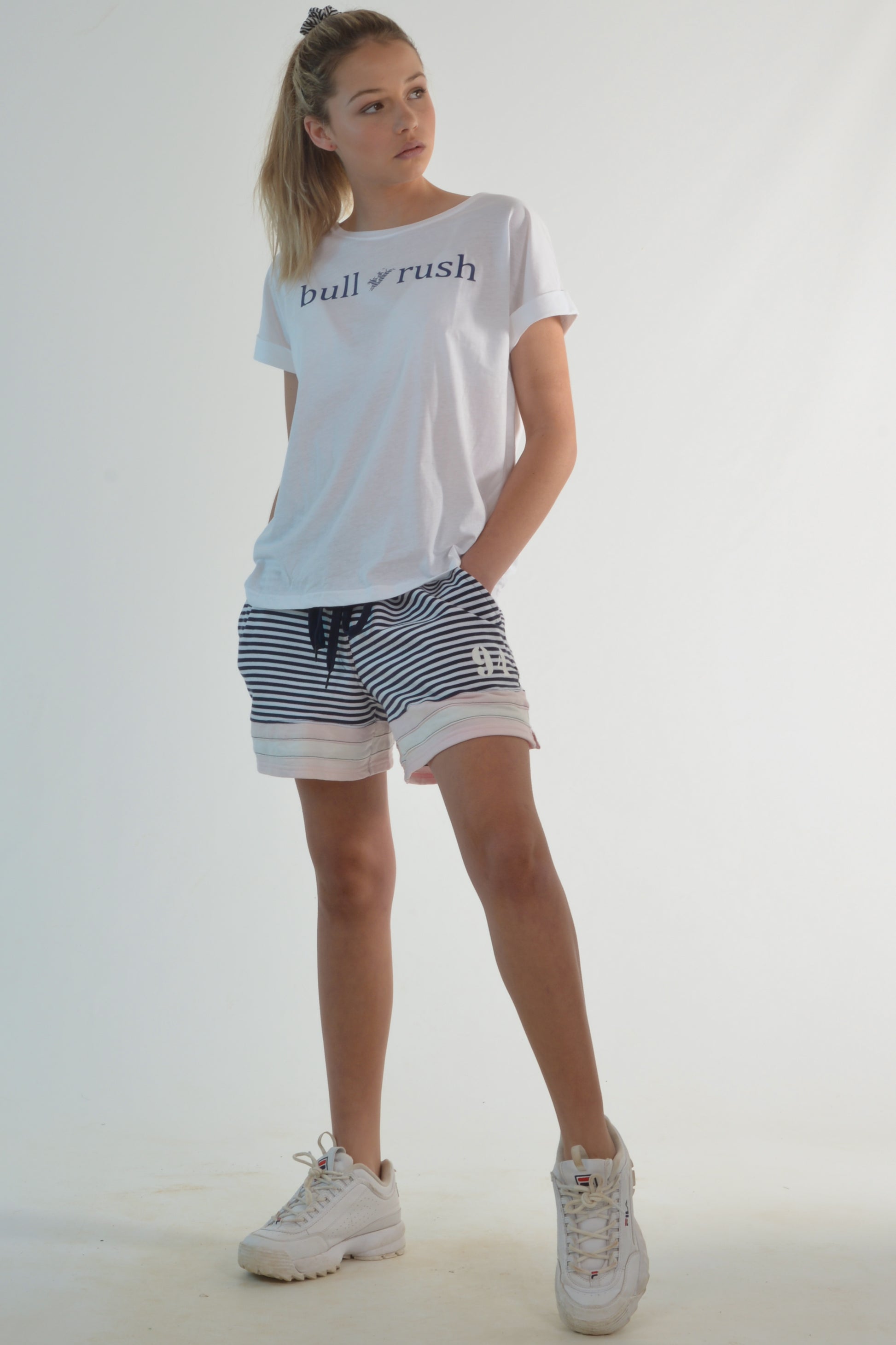 Our tee is semi fit to be worn over a longline singlet for a flattering silhouette. 100% fine cotton jersey with print.