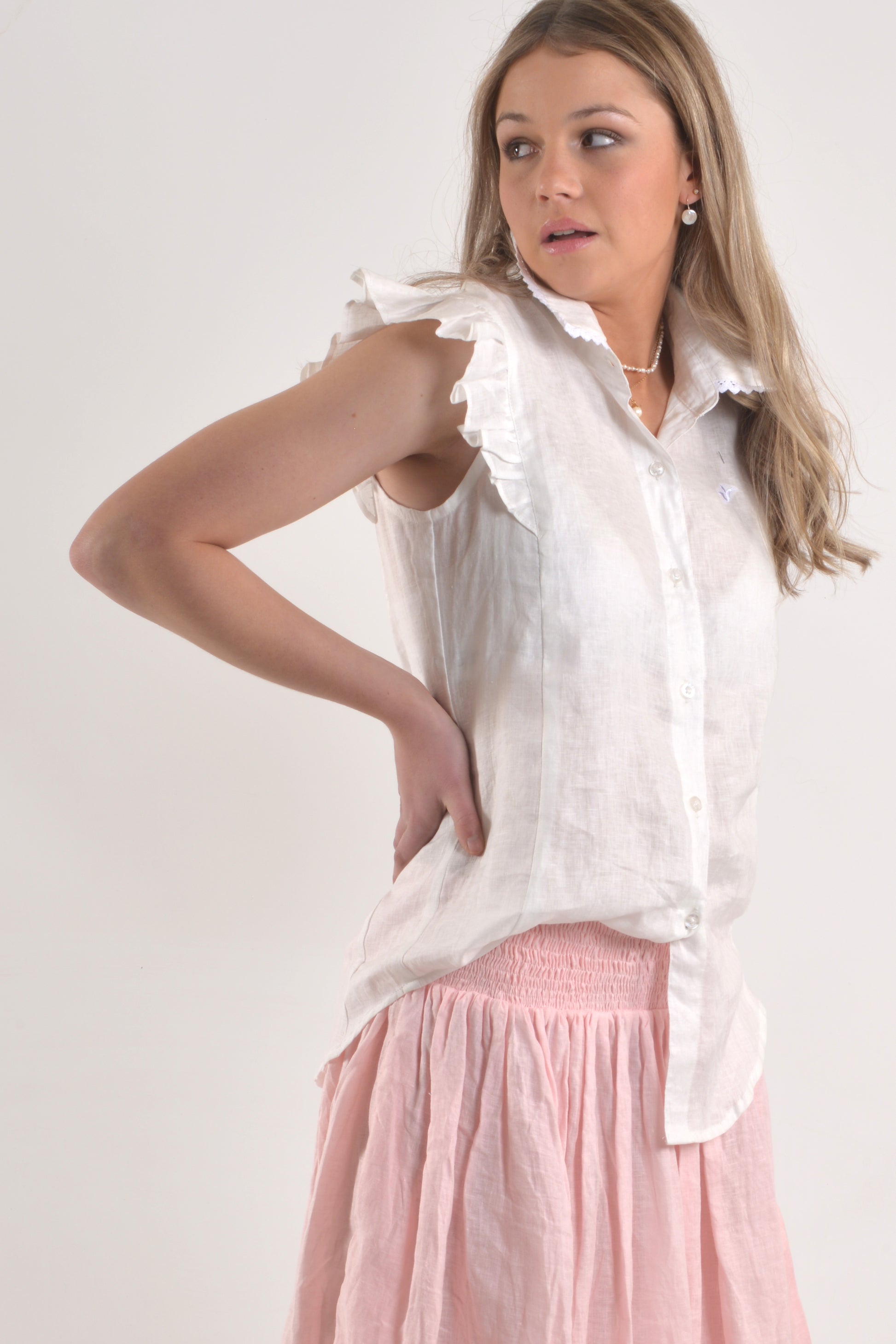 The Apley shirt is pure linen with cotton lace collar trims, semi fitted with beautiful ruffle sleeve trims. Teamed with our VINTAGE BOOTLEG JEAN.