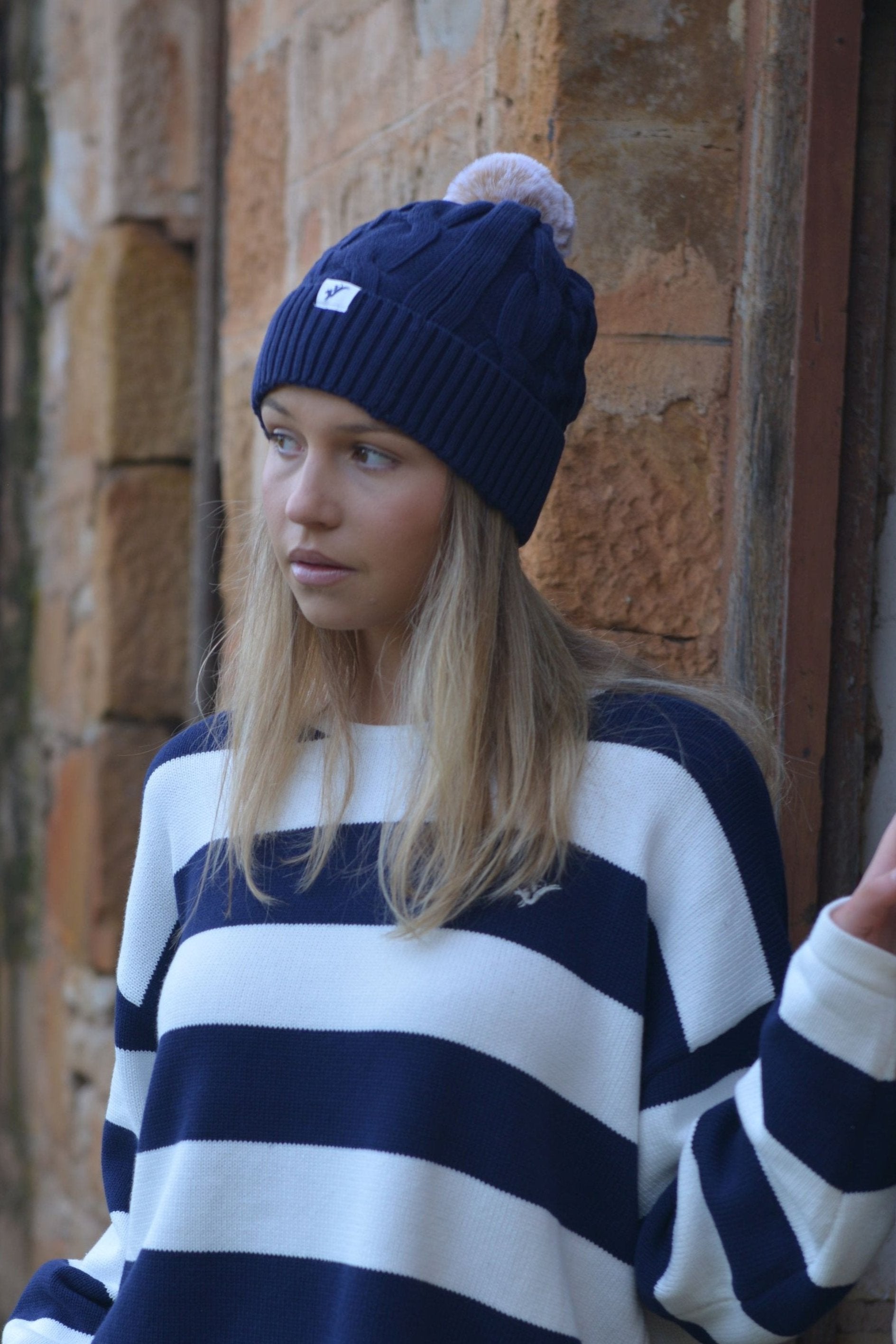 Introducing our Cotton Pom Pom Beanie, designed to match our knitwear collection in three versatile colors! This beautiful beanie features a cotton cable knit with a turn-down cuff and our iconic BullRush logo. The pom-pom is removable, making it easy to wash or wear the beanie without it. Enjoy the perfect blend of style and comfort!