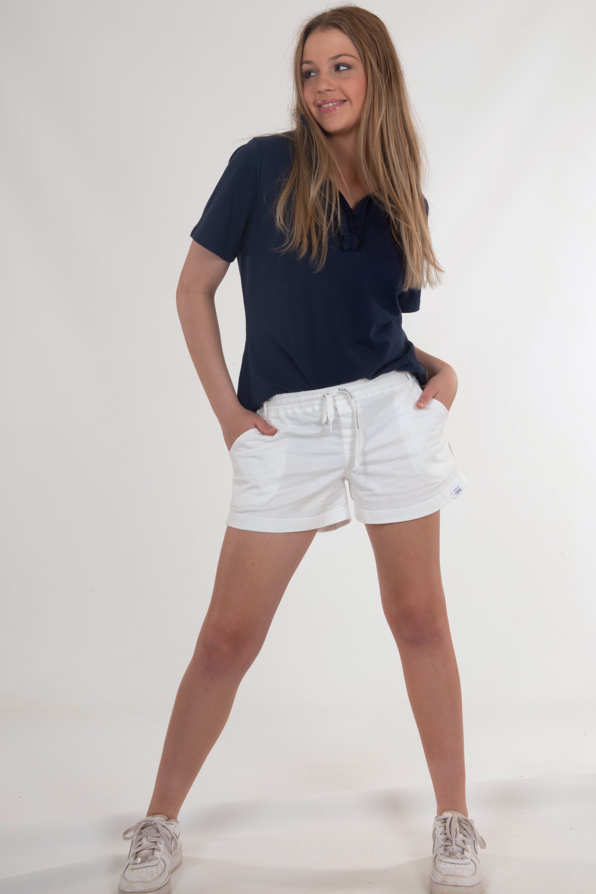our size chart. For our denim, she wears a size 6. In tops, she wears a size S,