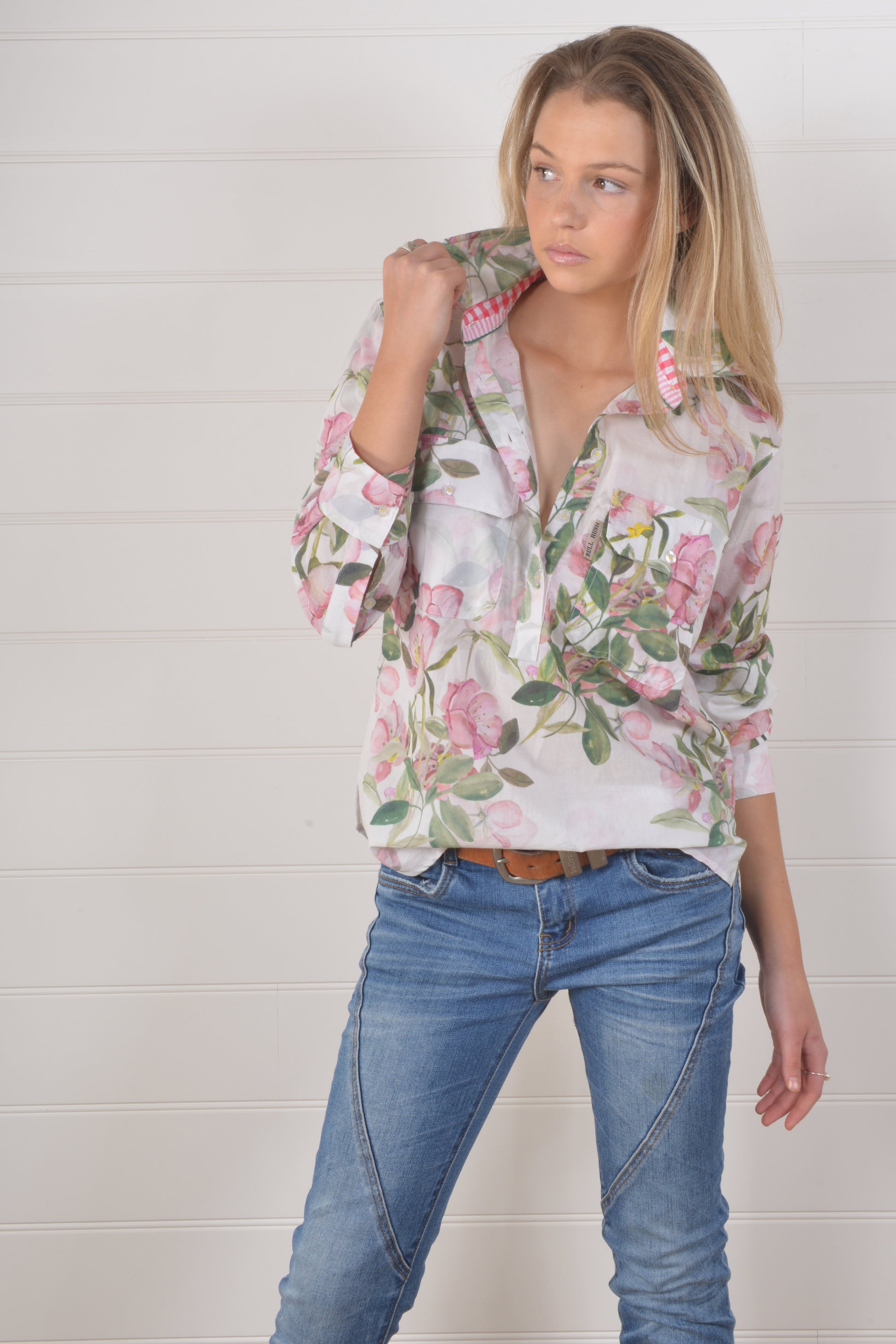 Fall in love with our unique print, inspired by the Coco rambling rose. This stunning top combines soft cotton voile with charming gingham and tripe trims, featuring a tab front and semi-fit silhouette for a relaxed, feminine look.