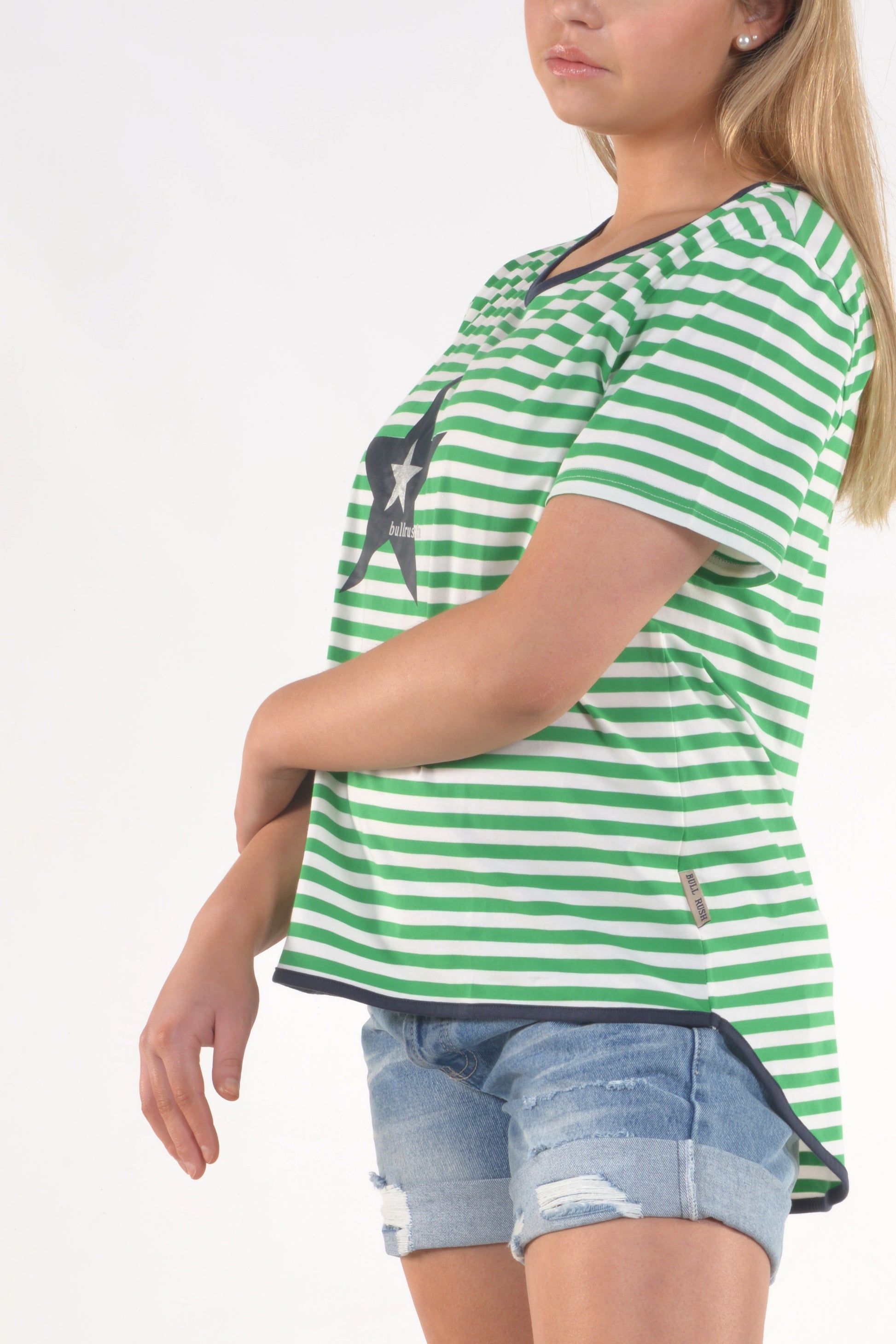 Brighton is a cotton spandex crew neck tee with a blend of print and embossed star and logo feature. A favorite silhouette with scoop hem.