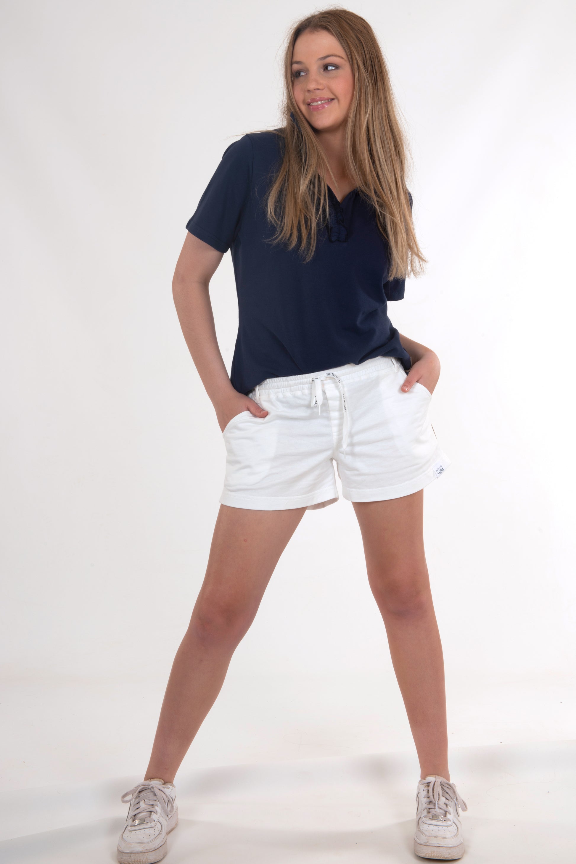 our size chart. For our denim, she wears a size 6. In tops, she wears a size S,