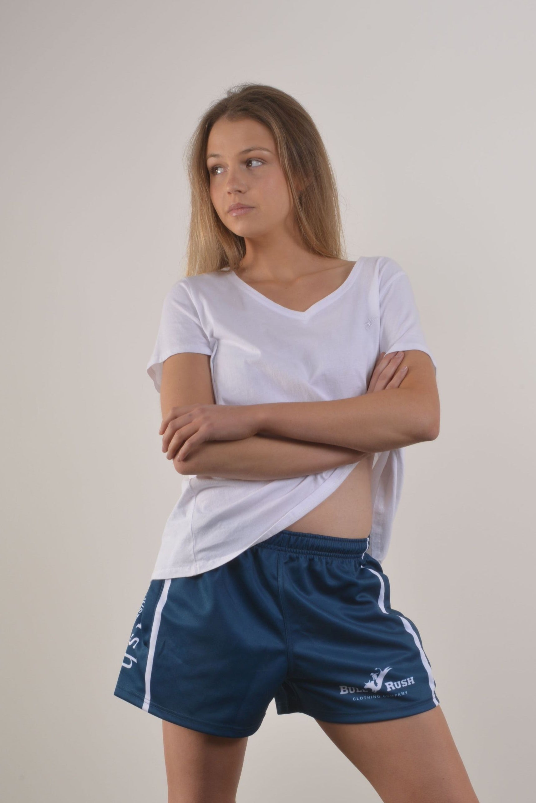 BullRush navy footy shorts, in a unisex style for both women and men.