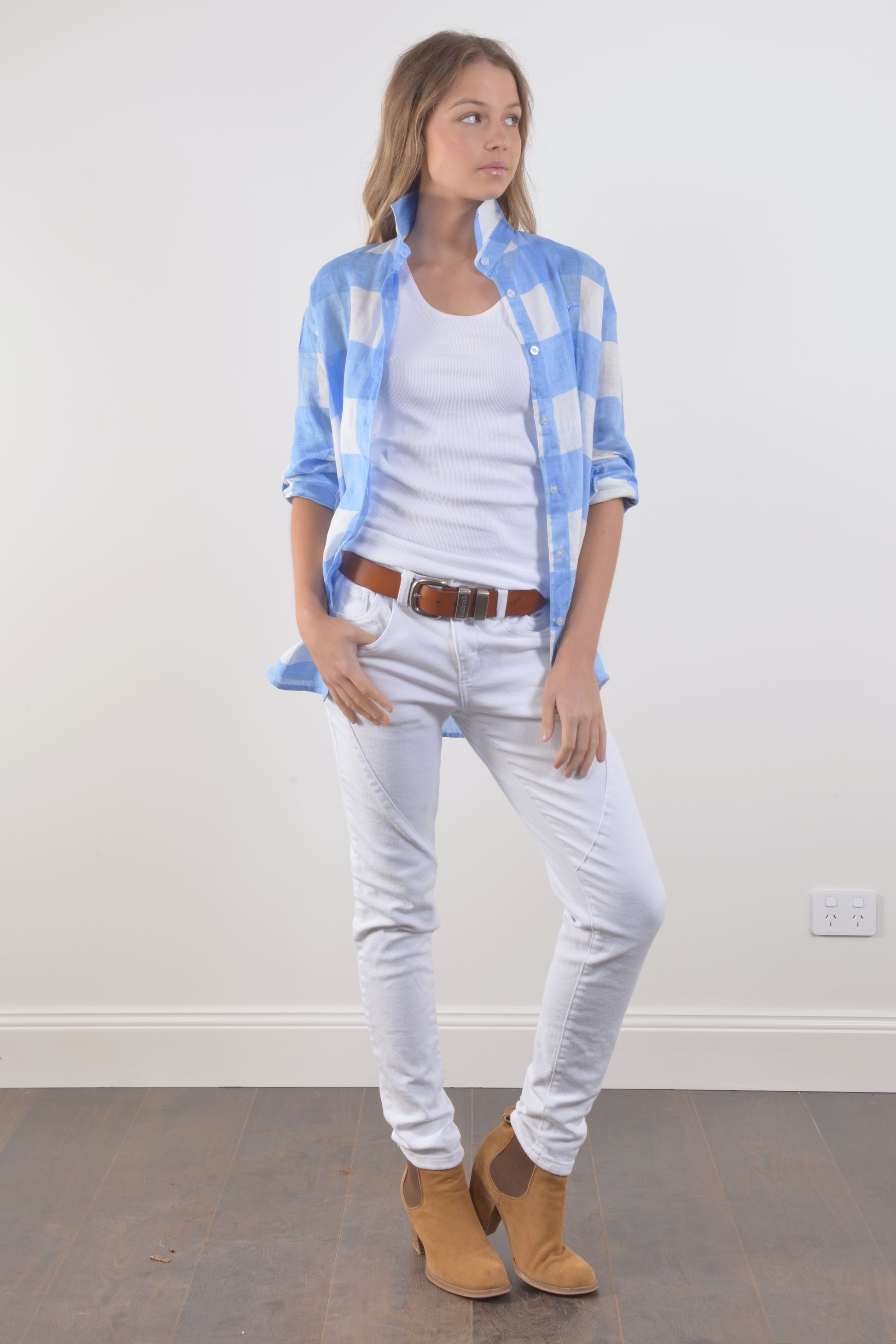 our size chart. For our denim, she wears a size 6. In tops, she wears a size S,