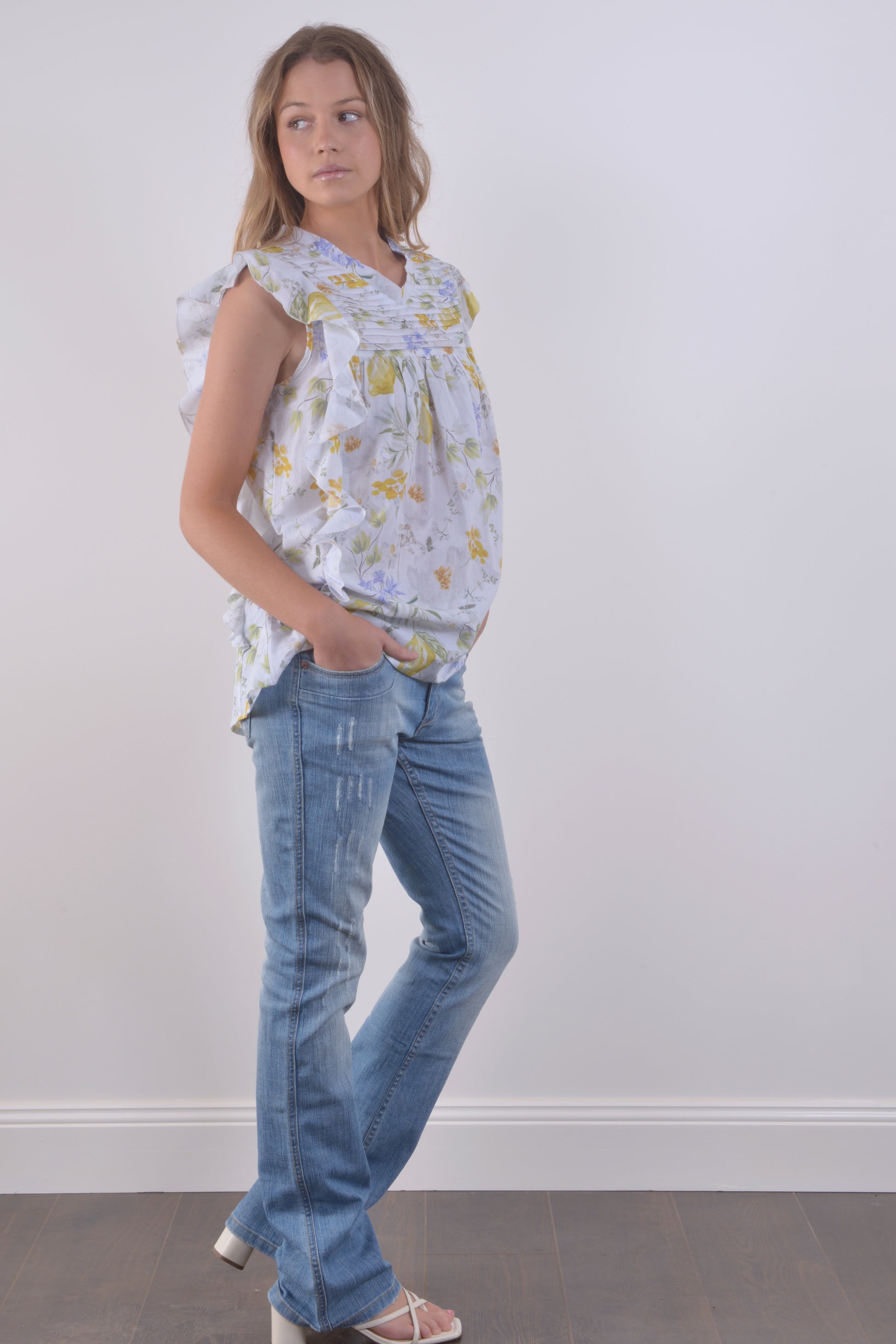our size chart. For our denim, she wears a size 6. In tops, she wears a size S,