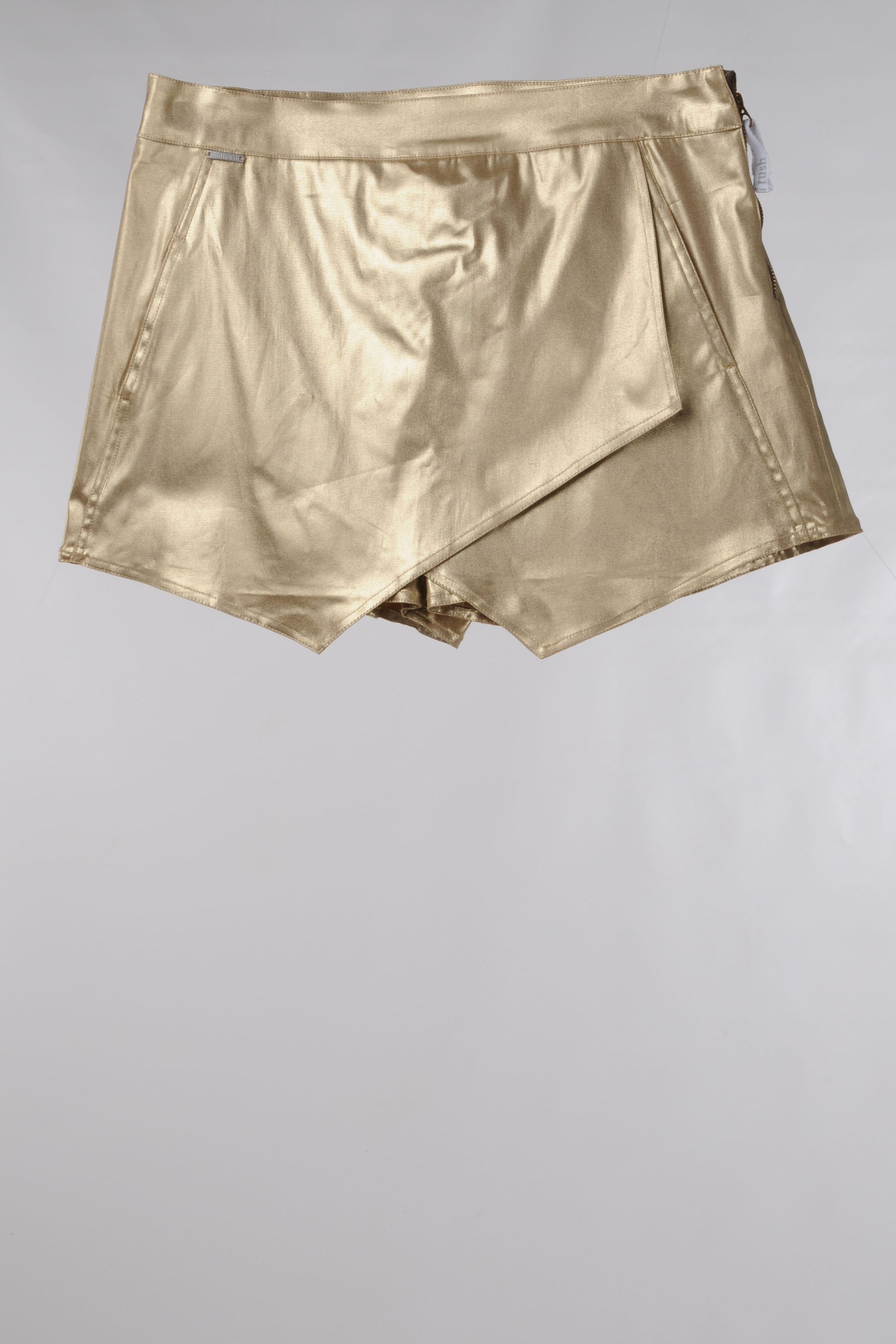 The flattering skort is made from cotton spandex coated in a mirage type film to make it shiny. Stretchy and comfortable for a bit of glitz.