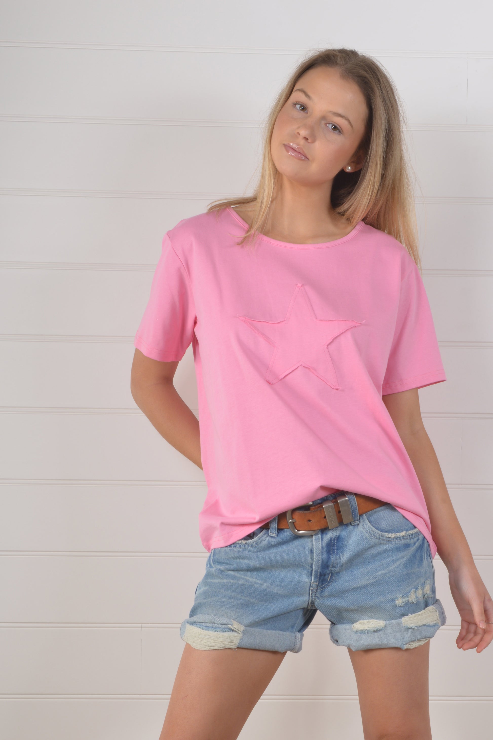 Refresh your summer wardrobe with our signature star tee. Aa perfect blend of comfort and style. This versatile tee boasts a classic crew neckline, short sleeves, and a playful vintage star. Its relaxed fit ideal for pairing with your favorite skirts, jeans, or lounge pants. Slip on sneakers to complete the look and elevate your off-duty style.